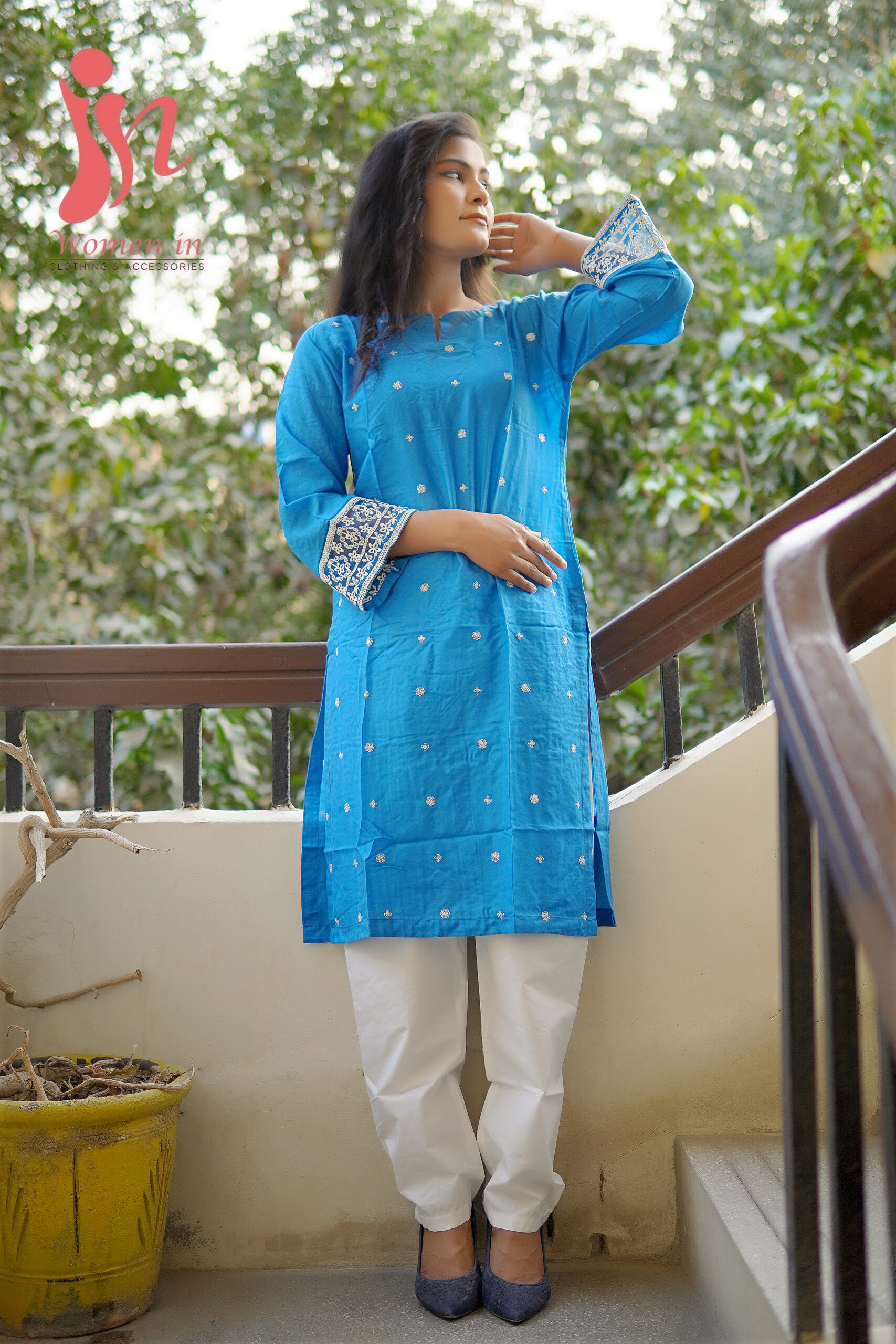 The stunning bright blue kurta is beautifully adorned with delicate embroidery motifs all over, while the sleeves feature intricate embroidered borders that add a refined traditional touch. Paired with 100% pure cotton plain trousers enhanced with elegant lace detailing, this 2-piece suit delivers both comfort and sophistication.
